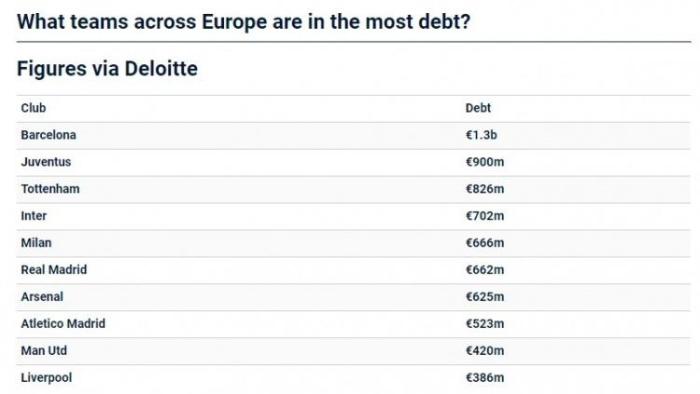 24直播网06月01日讯 据国际会计事务所德勤统计,巴萨有13.5亿欧元的债务,在所有欧洲足球俱乐部里排名第一。