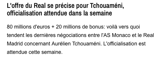 据悉,皇马的报价总额高达1亿欧元,其中固定转会费为8000万欧元,外加2000万欧元的浮动条款。皇马的报价已经达到了摩纳哥预期。由于球员本人坚持想离开法国去伯纳乌踢球,最终大巴黎和利物浦不得不退出了这场竞争。法媒表示,这笔签约有望在本周达成协议并且最终完成。