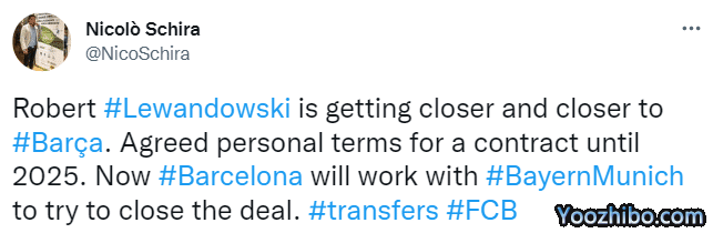 斯基拉表示,莱万现在已经和巴萨谈妥个人条款,合同持续到2025年,接下来巴萨将与拜仁谈判,尝试完成交易。