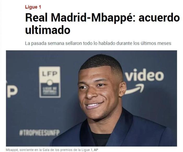 姆巴佩近日称5月28日前宣布自己的未来,他和巴黎的合同今夏到期。《马卡报》以《皇马姆巴佩达成最终一致》为题,称他上周已经和皇马完成签约。
