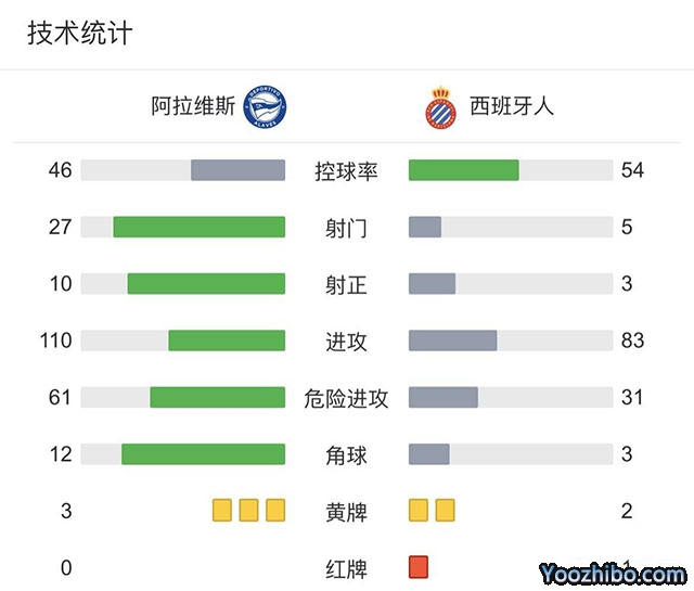 全场比赛结束,阿拉维斯2-1西班牙人。