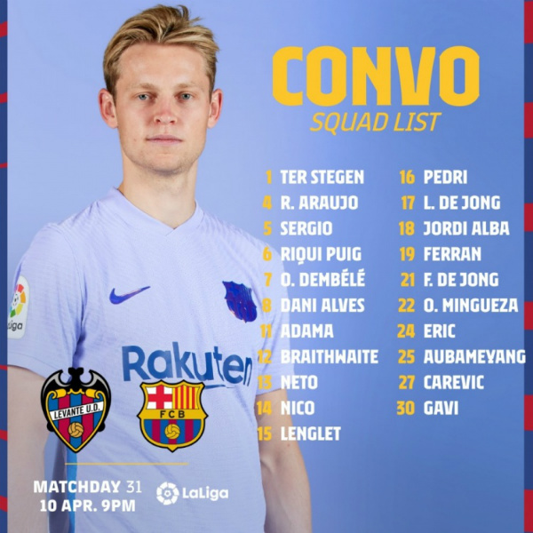 4月9日24直播网讯 北京时间4月11日凌晨,巴萨将在西甲第31轮比赛中客场对阵莱万特,巴萨公布了本场比赛的球员名单,德佩、皮克因伤缺席。