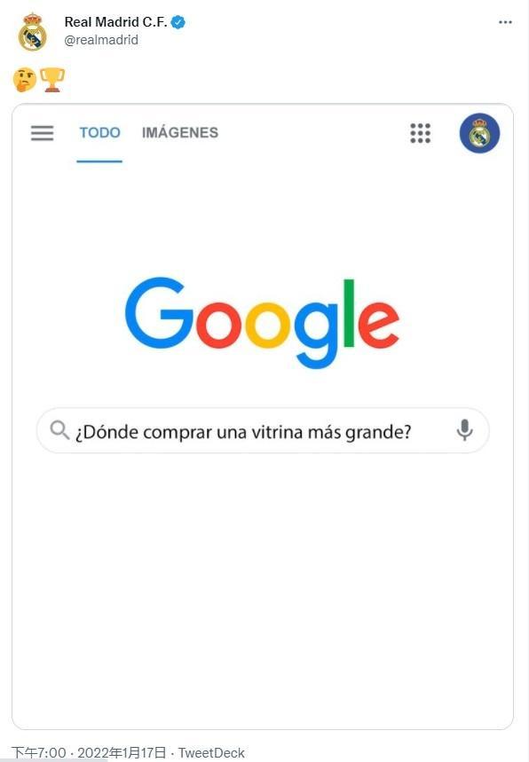 皇马官方社交媒体晒出谷歌搜索截图:去哪里买一个更大的奖杯陈列柜?网友直呼皇马太凡尔赛了。