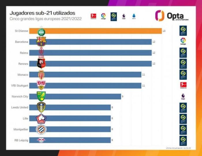 来源:24直播网01-12 09:3924直播网01月12日讯 ,著名数据网站Opta统计了本赛季五大联赛使用U21球员的榜单,圣埃蒂安13人高居榜首,巴萨、兰斯和雷恩12人并列第二。
