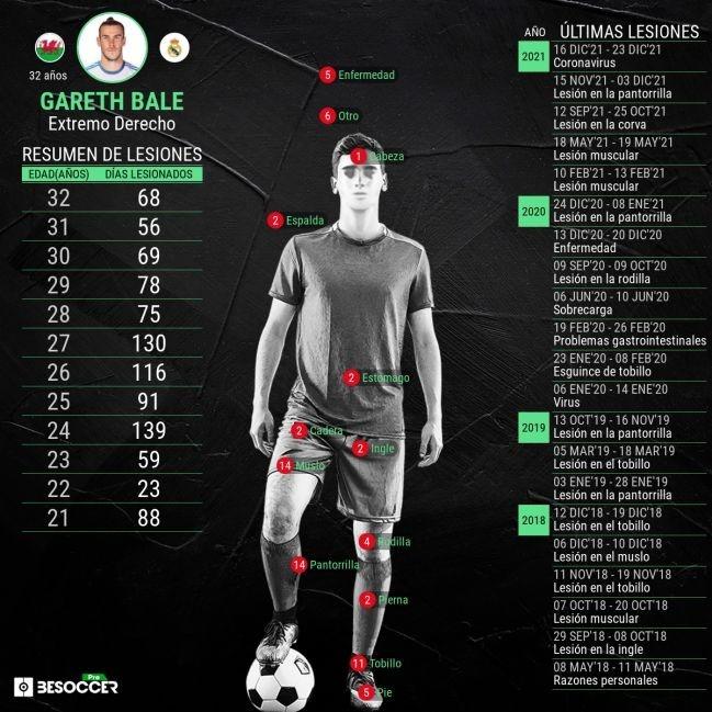 24直播网01月02日讯 ,据阿斯报报道,贝尔由于肌肉不适将缺席和赫塔菲的比赛。外媒besoccer统计了贝尔21岁到32岁的缺席的天数,其中24岁和27岁,缺席的天数都超过了130天。