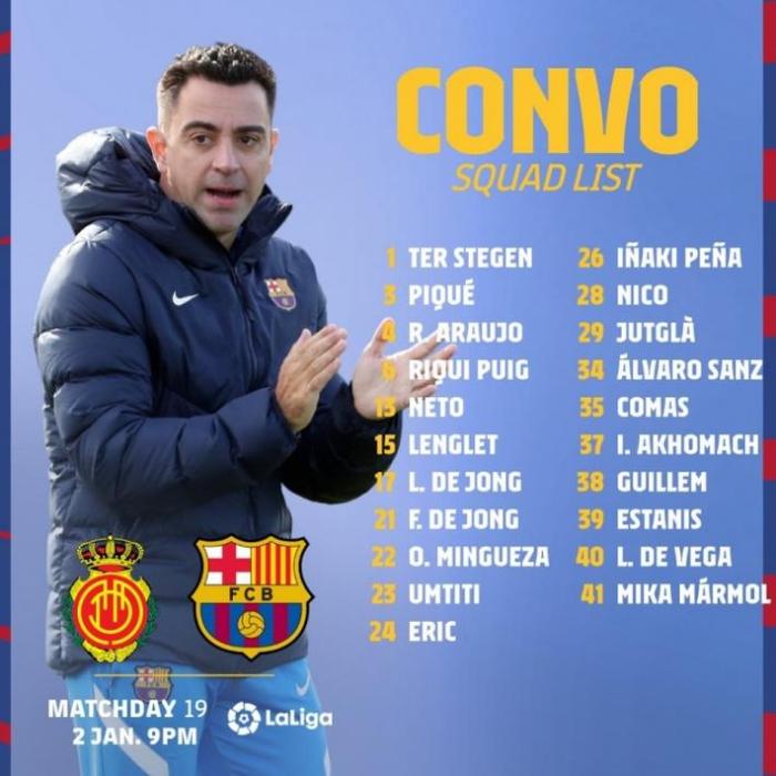 来源:24直播网01-02 09:3324直播网01月02日讯,巴萨公布了客战马洛卡的大名单。由于疫情和伤病的原因,一线队只有11人入选。其中之前感染新冠病毒的乌姆蒂蒂和朗格莱进入名单。