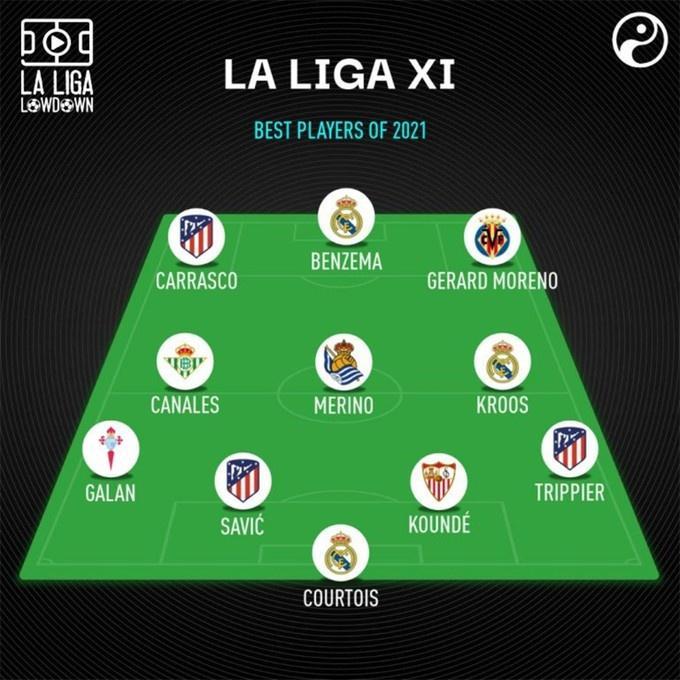 24直播网01月01日讯 Squawka统计了西甲联赛2021年年度最佳阵容,皇马和马竞各有3人入选,巴萨则意外的无人入选。