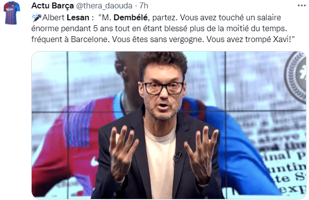 这位记者痛斥登贝莱缺乏职业素养,他在社交媒体上透露:“登贝莱先生,你快走吧!你拿了5年高薪,却超过一半的时间在养伤。”