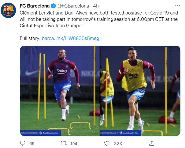 巴萨今天凌晨证实了这一消息,并表示两名球员已被隔离,将不会参加今天的训练课。