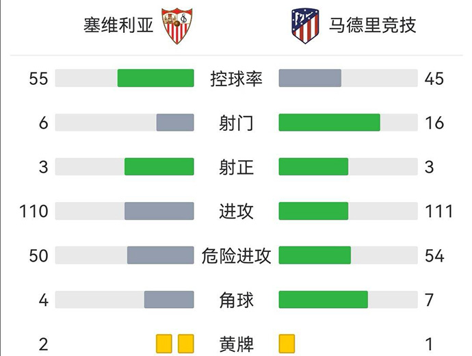 马德里竞技首发:13-奥布拉克、23-特里皮尔、18-费利佩、4-孔多比亚、22-埃尔莫索、21-卡拉斯科、6-科克、14-马科斯-略伦特(39'5-德保罗)、11-勒马尔、10-安赫尔-科雷亚(46'7-若昂-菲利克斯)、9-苏亚雷斯(56'19-马特乌斯-库尼亚)