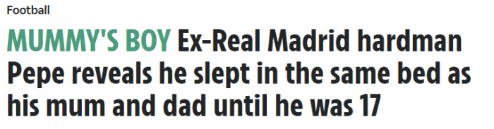 24直播网12月11日讯 据英国媒体《太阳报》援引葡萄牙媒体TribunaExpresso报道,前皇马中卫佩佩在接受采访时表示,自己在17岁前都和父母在一张床睡觉。