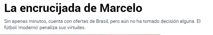 《马卡报》表示,马塞洛的皇马生涯即将画上句号,他的合同在明年6月到期,目前来看双方不会续约。