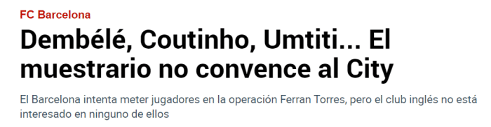 24直播网讯 据西班牙媒体《马卡报》报道,巴萨想用乌姆蒂蒂、库蒂尼奥、登贝莱或朗格莱中的一位加钱交换费兰-托雷斯,但曼城方面没有兴趣。