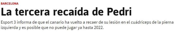 巴萨新帅哈维不希望佩德里的伤病出现复发,这位18岁的小将可能会到2022年再复出。