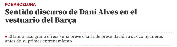来源:24直播网11-16 19:2724直播网11月16日讯 ,西班牙媒体《世界体育报》披露了阿尔维斯在回归巴萨后首次在更衣室的演讲。