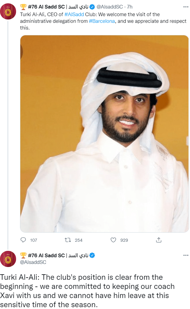 萨德俱乐部随后发文表示:“欢迎巴萨代表团的到来,我们对此表示尊重。俱乐部的立场一直很明确,现在正值赛季敏感阶段,我们不能在这个时候让主教练哈维离队。”