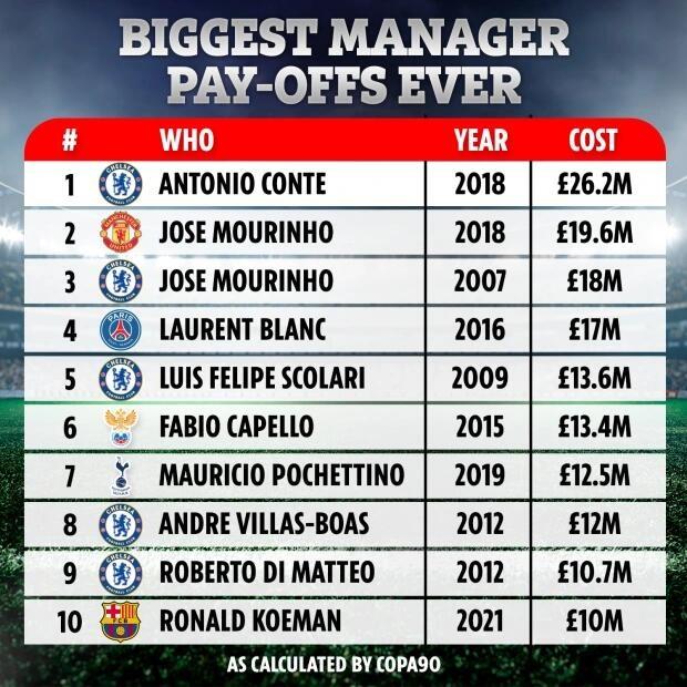 如图,18年孔蒂离开切尔西的时候,切尔西为其支付了2620万英镑的违约金,当然这个违约金孔蒂拿得并不轻松,据说双方还因此打官司了。而第二的是18年穆里尼奥离开曼联,他拿到了1960万英镑的违约金,第三是07年的时候穆里尼奥离开切尔西,拿到了1800万英镑的违约金。第四是16年的时候,布兰科离开巴黎,拿到了1700万英镑的违约金,第五是斯科拉里在09年离开切尔西,拿到了1600万英镑的违约金。