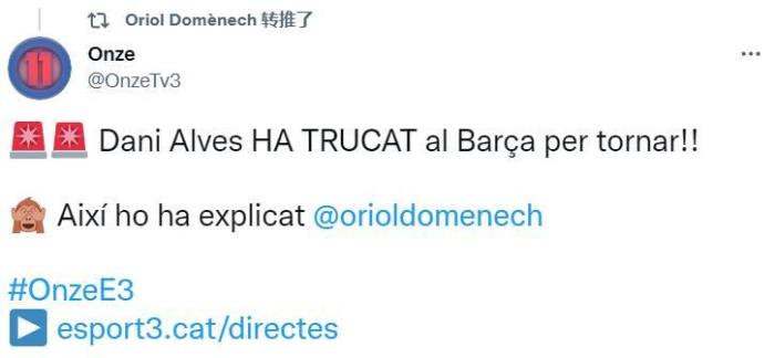 记者:阿尔维斯联系巴萨,表达回归意愿