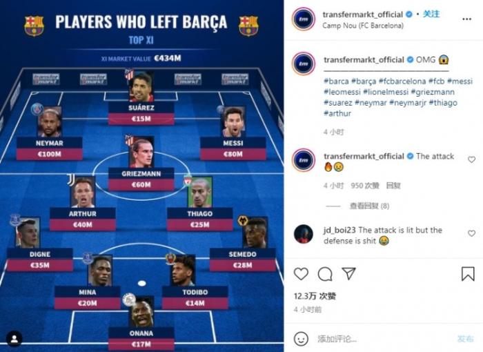 来源:24直播网10-13 19:3724直播网10月13日讯 本赛季,巴萨的战绩直线下滑,而球队之所以战绩不佳,主要是因为送走了梅西和格列兹曼,球队实力大幅下降,球员的信心也有所下降。而近日,德国权威媒体《转会市场网》盘点了最近几年离开巴萨的最佳阵容,这个阵容总价4.34亿欧元,不知道这套阵容和现在巴萨的主力阵容相比,哪一套阵容更强呢?话不多说,一起看阵容!