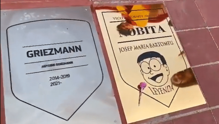 24直播网10月03日讯 在今天巴萨0-2不敌马竞的比赛前,有马竞球迷在格列兹曼的纪念牌旁边放了一块印有巴托梅乌名字和动画《哆啦A梦》角色野比大雄形象的牌子。