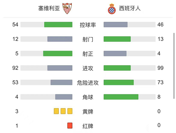 全场比赛结束,塞维利亚主场2-0西班牙人。