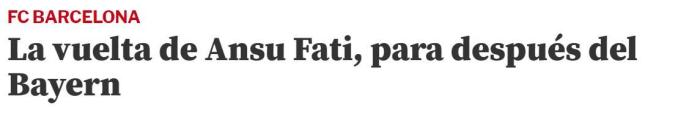 《世体》称,等到巴萨与拜仁的欧冠小组赛后,法蒂应该就会复出,他们想要等到法蒂完全恢复在让他上场比赛。