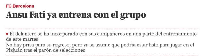 《世体》表示,法蒂目前已经恢复了球队的合练,但是巴萨方面仍然不急于让他复出。西甲第三轮联赛将在八月底进行,巴萨不会让法蒂在这场比赛中出场。等到9月份国际比赛日结束后,法蒂将会正式复出。到时将是西甲第四轮,巴萨与塞维利亚的焦点之战。