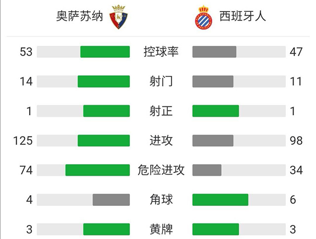 奥萨苏纳首发:1-塞尔希奥-埃雷拉、2-纳乔-比达尔、5-戴维-加西亚、4-乌奈-加西亚、11-巴尔哈(63'28-哈维-马丁内斯)、8-布拉沙纳茨、24-托罗、7-蒙卡约拉(62'6-奥耶尔)、14-鲁文-加西亚、17-布季米尔(71'9-路易斯-阿维拉)、18-基克