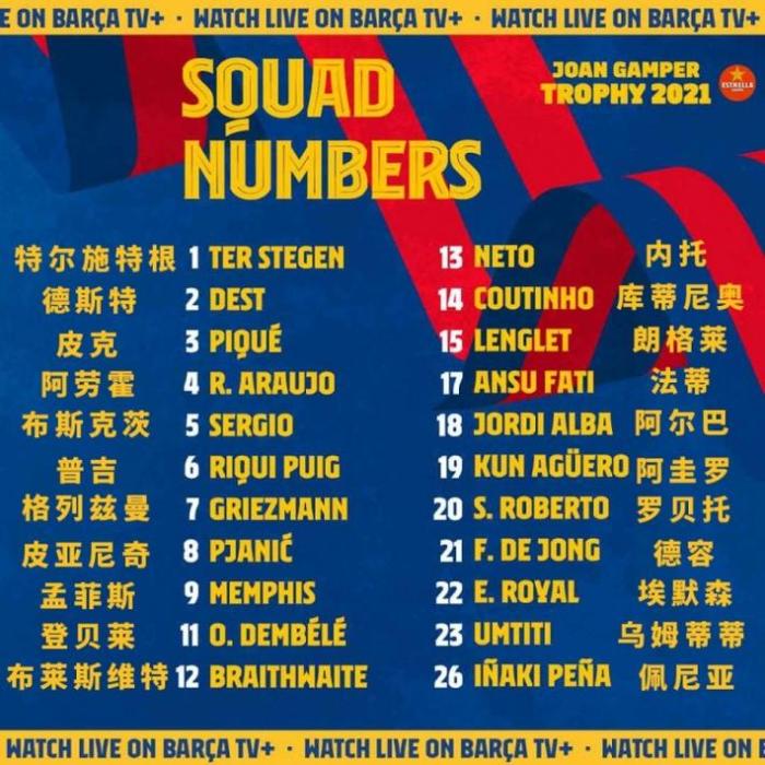 后卫:德斯特(2),皮克(3),阿劳霍(4),罗贝托(20),朗格莱(15),阿尔巴(18),埃莫森(22),乌姆蒂蒂(23)