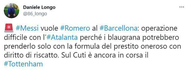 该记者表示,梅西希望巴萨能签下克里斯蒂安-罗梅罗,但考虑到巴萨的财政状况这会很困难。巴萨只能用租转买的方式签下罗梅罗,目前热刺依然在罗梅罗的争夺战中处于领先位置。