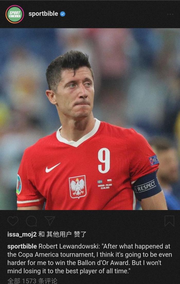 莱万在采访中说道:“在梅西赢得美洲杯冠军后,我认为我想要赢得今年金球奖变得更难了,但我不会介意输给历史最佳球员!”