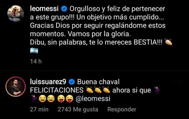 苏亚雷斯是在梅西的动态下面留言说出这段话的,在率队淘汰哥伦比亚之后,梅西兴奋地在个人社交账号上发文,表示为属于阿根廷这支球队感到骄傲和幸福,球队又完成了一个目标,将继续追求荣誉。而不出意外,密友苏亚雷斯第一时间现身评论区。乌拉圭神锋毫不避讳的留言道:“小伙子很棒!祝贺你!现在他们真的去跳舞了!”