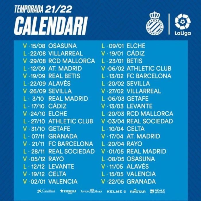 2021-22赛季西班牙人赛程: 11月和2月迎来加泰德比