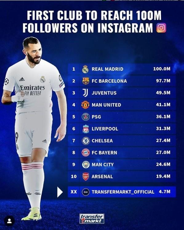 24直播网讯 北京时间昨天,皇马官方ins账号粉丝量达到1亿,皇马成为世界上第一家Instagram粉丝破亿的俱乐部。今天《德国转会市场》列出了各大豪门ins粉丝数量。