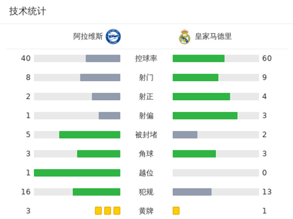 最终全场比赛结束,皇马1-0阿拉维斯。