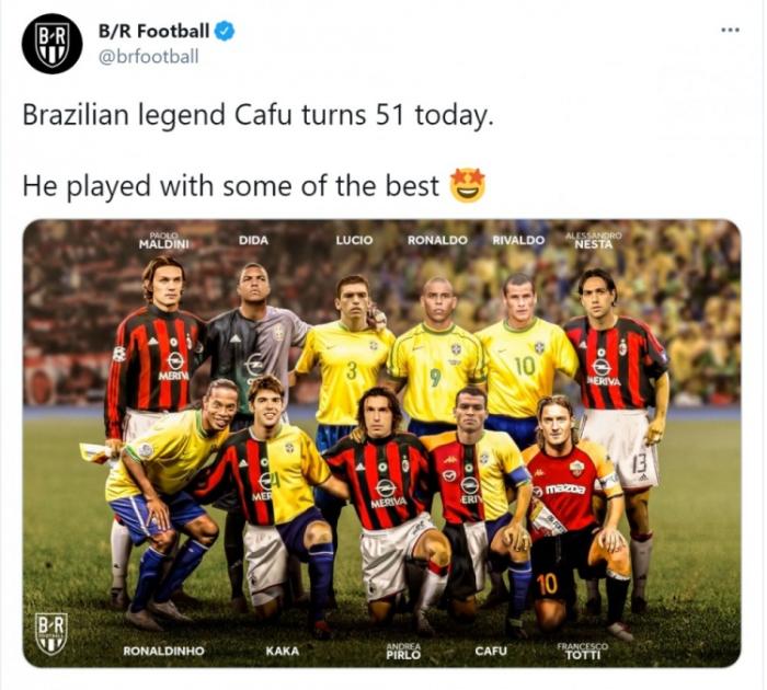 来源:24直播网06-08 19:2624直播网讯 昨天是巴西边后卫卡福的51岁生日,而欧洲权威媒体BR也适时的在推特上晒出了卡福队友的“最佳队友”阵容,而这个阵容可以说是群星荟萃,里面的球星几乎都是卡福同时代足坛最佳的球员。毕竟,卡福当初效力过米兰、罗马和巴西国家队。而当时的米兰和罗马都是足坛数一数二的球队,而巴西国家队在当时也是足坛独一档的球队哦!