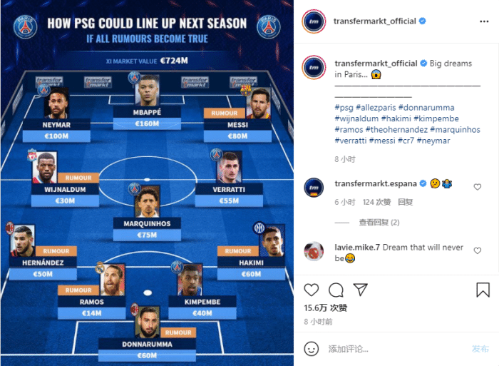今天,德转就预测了巴黎下赛季可能排出的首发阵容,这套阵容总身价高达7.24亿欧元,具体如下:
