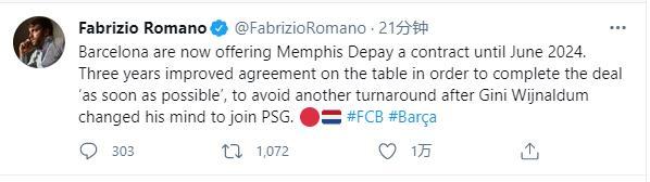 为了防止维纳尔杜姆被巴黎截胡的情况重现,巴萨提供了德佩一份为期3年的合同,并提高了待遇,他们希望德佩尽快签约。