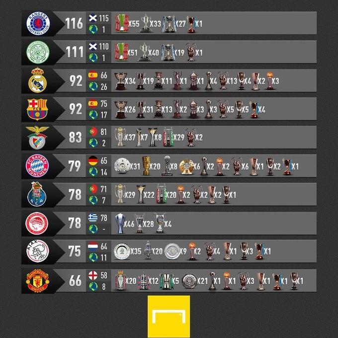 24直播网讯近日,进球网统计了到目前欧洲足坛俱乐部的冠军排行榜,苏超两大豪门流浪者和凯尔特人排名前二,皇马、巴萨均是92冠并列第三。