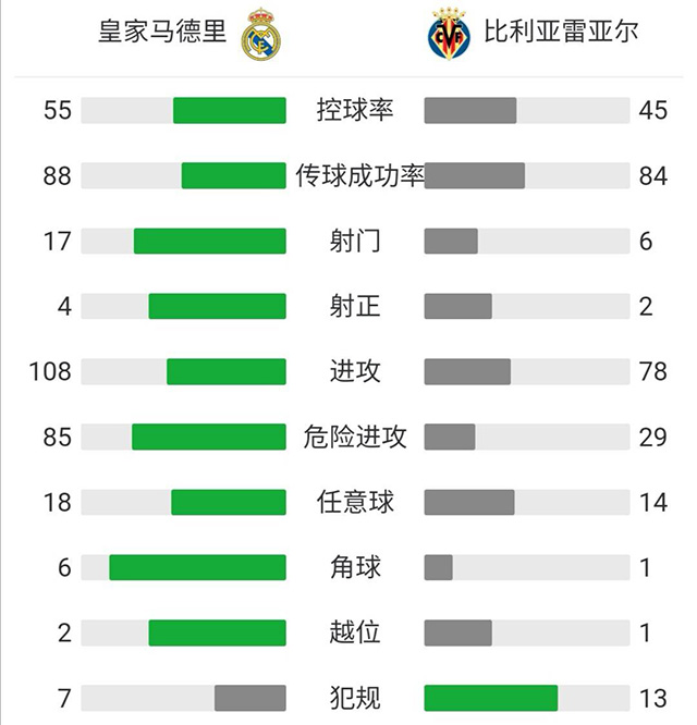 全场比赛结束,皇家马德里2-1比利亚雷亚尔。