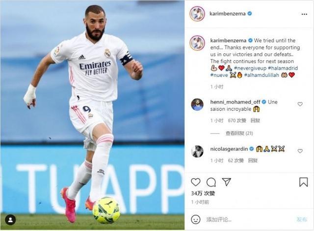 本泽马INS:“我们一直战斗到了最后,感谢每个在我们赢球或者失利时均给予支持的人,下赛季我们将继续战斗。#永不放弃#皇马万岁!”