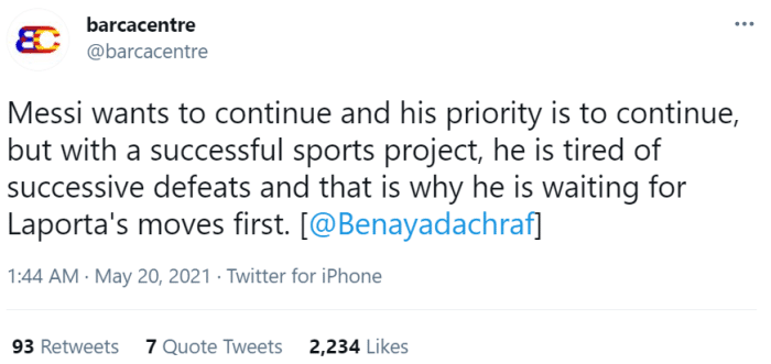 24直播网讯 据拜因体育记者Achraf Ben Ayad报道,梅西想要继续留在巴萨,但他需要俱乐部给出一个有说服力的计划。