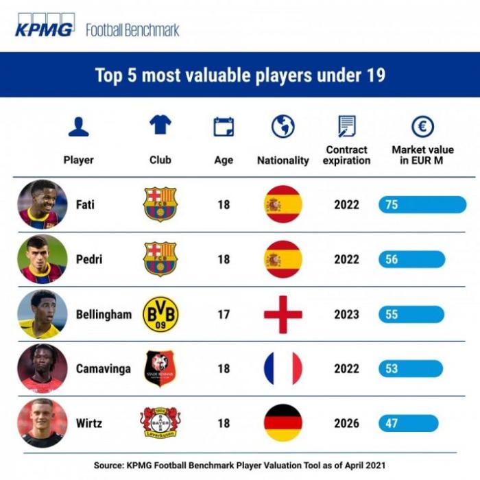 来源:24直播网05-19 10:4724直播网讯 全球知名审计机构毕马威近日更新了足坛19岁以下球员身价排名,法蒂7500万欧元居首,佩德里5600万欧元第二,贝林厄姆5500万欧元第三。