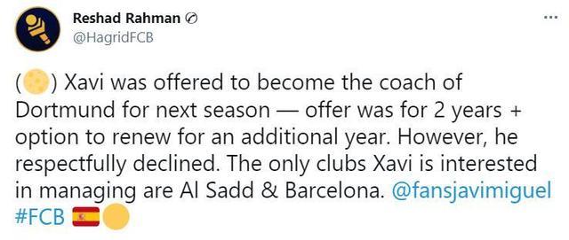 多特给哈维开出了一份2+1的合同,邀请他作为主帅执教球队,但是哈维礼貌地拒绝了,他只对