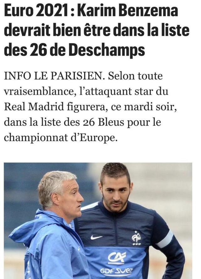 来源:24直播网05-18 19:4424直播网讯 此前,法国知名媒体《队报》曾发文称,关于本泽马回归国家队的话题,已不再是法国男足的禁忌,也许名单中会出现皇马前锋的身影。而北京时间5月18日晚,法国另外一家权威媒体《巴黎人报》也跟进了报道,本泽马确实“极有可能”会进入到德尚的法国男足国家队参加欧洲杯的26人大名单中。