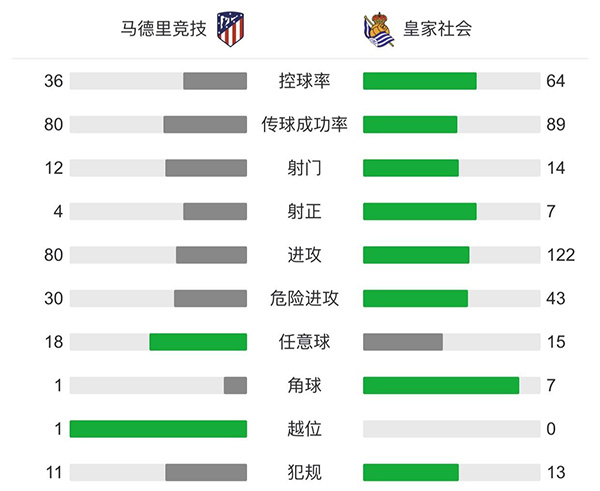 第16分钟,马竞取得领先,略伦特禁区前送出挑传,卡拉斯科停球后一脚低射将球打进,马德里竞技1-0皇家社会。