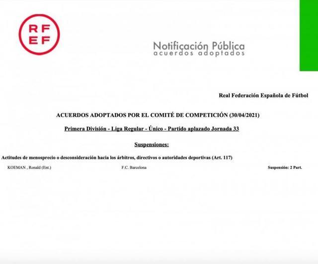 巴萨在得知此消息后将进行上诉,科曼是在比赛第66分钟被主裁判巴勃罗-冈萨雷斯罚出场的。