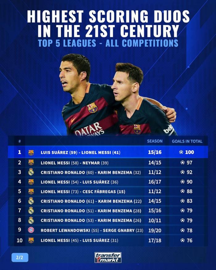 来源:24直播网04-25 20:1024直播网讯 足坛想要进球,不光需要依靠自己,还需要依靠队友。而许多球队都有一些经典的进攻组合,那么在本世纪,在欧洲足坛,哪些进攻二人组是足坛最好的进攻二人组呢?近日,德国权威媒体《转会市场网》就盘点了本世纪足坛单赛季进球最多的二人组,其中梅西五次上榜,C罗四次上榜。那么还有一次上榜的是谁呢?话不多说,一起看数据吧!