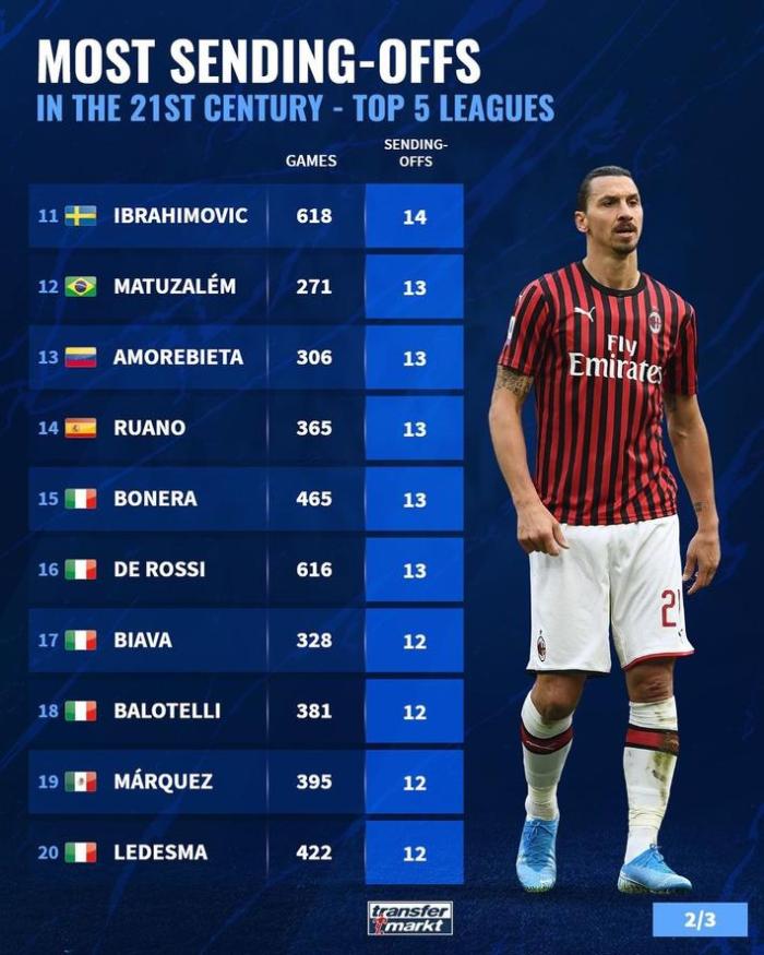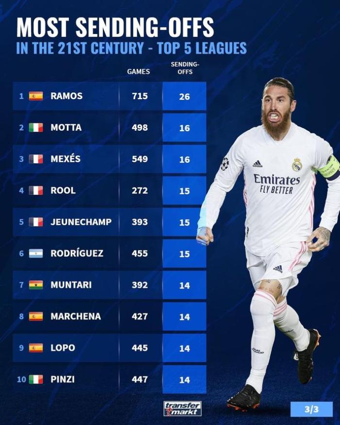 21世纪五大联赛红牌榜: 拉莫斯高居榜首