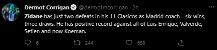 交手过11次,战绩为6胜3平2负,只输过两场,而且齐达内带队先后击败过路易斯-恩里克、巴尔韦德、塞蒂恩以及罗纳德-科曼执教的巴萨。